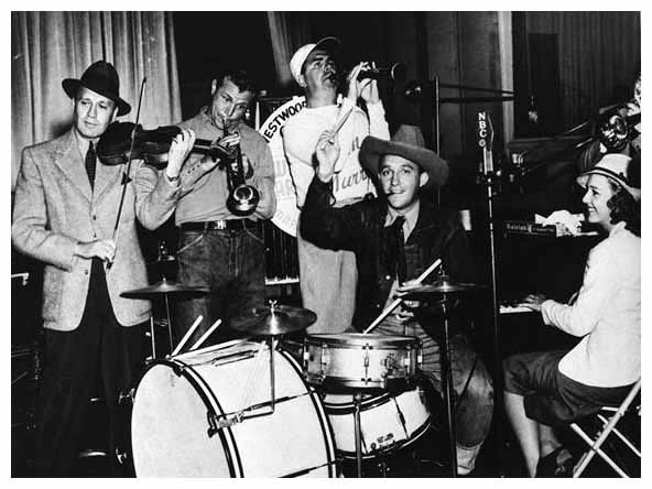 From left: Jack Benney, Dick Powell, Ken Murray, Bing Crosby on drums, Shirley Ross.